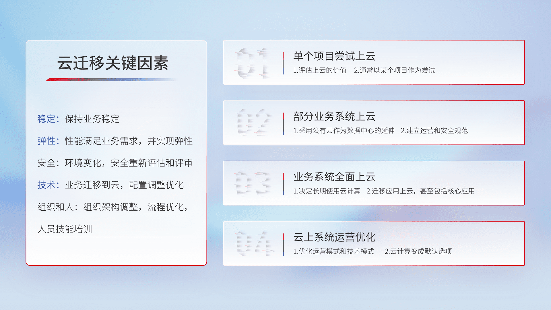 结合实际业务,,从规划设计、、、云平台选型、、云原生改造、、数据迁移、、、、集成交付,,迁移全过程为客户识别最佳上云路径,,,做好风险识别管理,,设计网络架构、、、身份权限、、、安全审计合规、、操作审计、、、日志审计、、、、监控告警策略、、多站点容灾设计等,,,,对云上基础设施进行整体规划,,,,提升IT治理水平,,,以满足弹性、、高可用、、高性能的需求。。