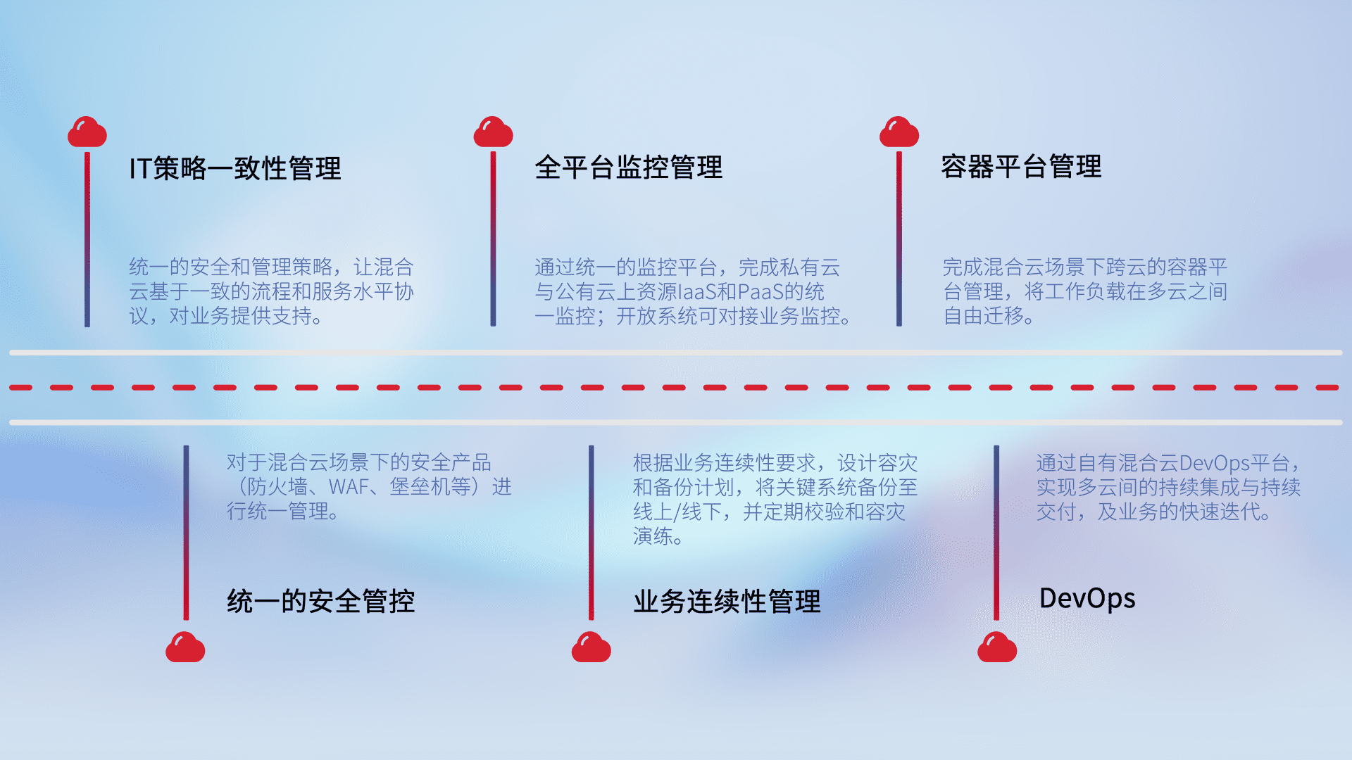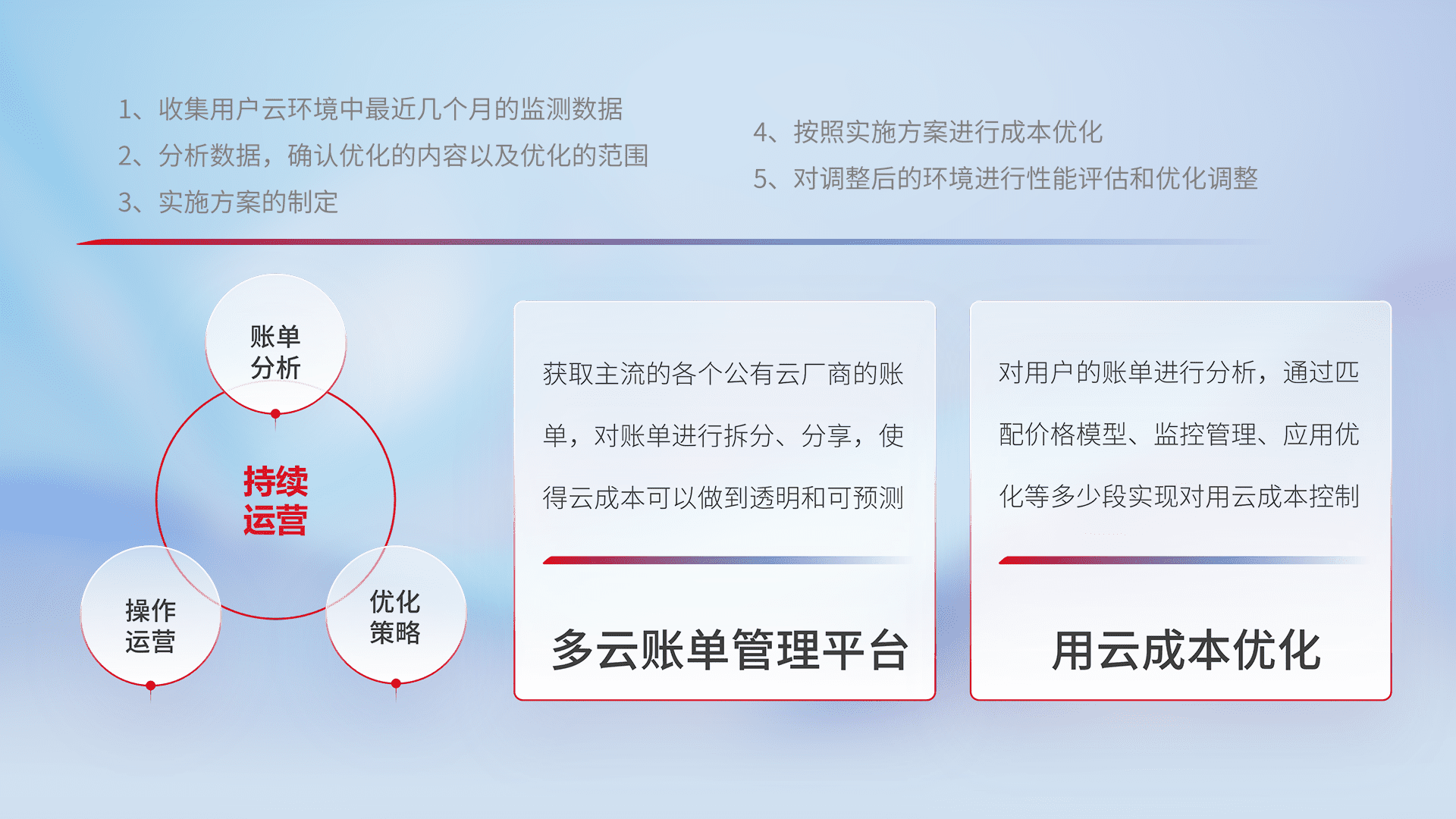 通过多云纳管,,,,以统一的资源数据模型把客户的云资源进行抽象和封装,,进而实现对多云资源的统一操作,,保障云资源管理的可靠性、、稳定性与可用性。。。量身定制化运维内容,,,,配置、、、、开发运维、、补丁管理、、备份、、、、监控、、、认证和访问管理、、、审计和日常巡检等,,,,保障在用云过程中的可靠度,,,,稳定度以及高可用率。。。