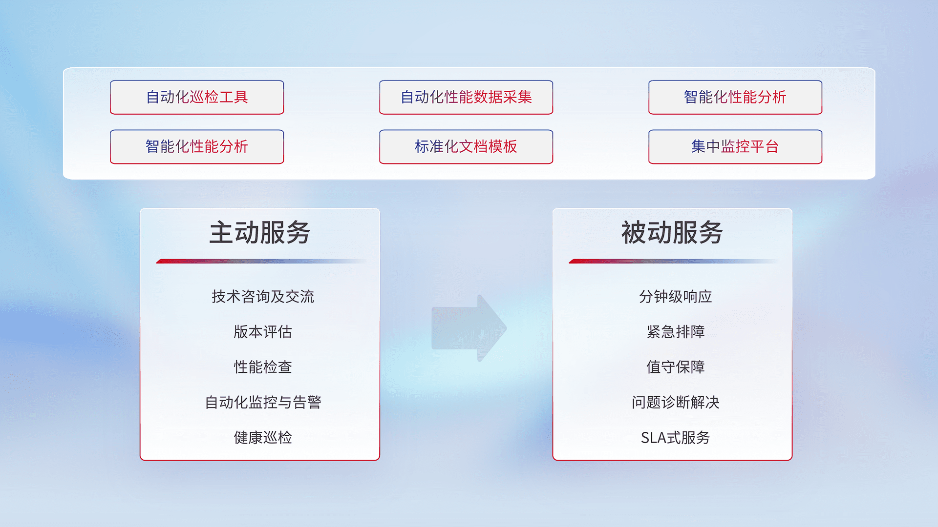 智能化工具和标准化文档,,,保障服务质量,,,提供主动服务(包含技术咨询、、、、版本评估、、、、性能检查、、、、自动化监控与告警、、、、健康巡检)和被动服务包含(分钟级响应、、、、紧急排障、、、值守保障、、、问题诊断解决、、SLA服务)。。。。